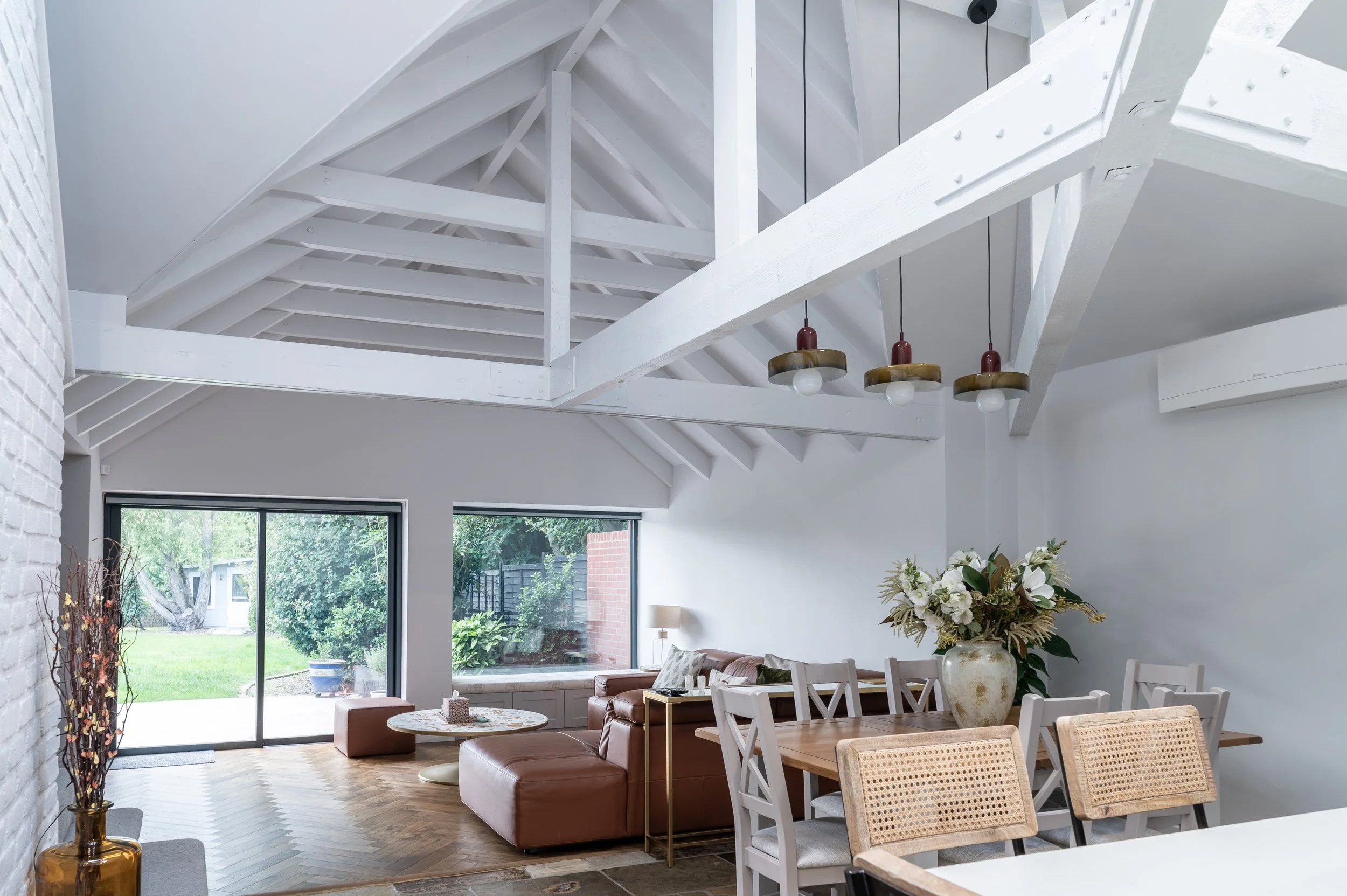 Exposed timber beams: Retaining the original structure to add character and warmth.